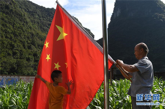 在廣西都安瑤族自治縣龍灣鄉(xiāng)琴棋小學(xué),黃若珍老師(右)和學(xué)生準(zhǔn)備升國(guó)旗(2017年8月31日攝)。新華社記者 陸波岸 攝