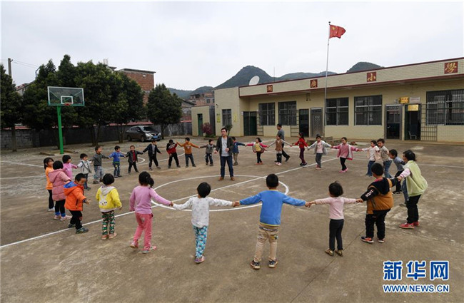 在廣西富川瑤族自治縣湖廣小學(xué),學(xué)校師生課間一起做游戲(3月20日攝)。湖廣小學(xué)是一所位于湘桂邊界的學(xué)校,學(xué)生一部分來(lái)自湖南,一部分來(lái)自廣西。兩名老師,一名來(lái)自湖南,一名來(lái)自廣西。新華社記者 陸波岸 攝