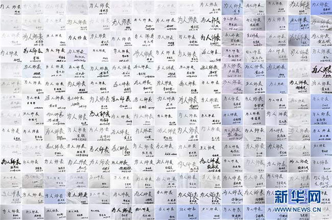 這張拼版照片是2012年至2019年拍攝的210名廣西山區(qū)教師手書的“為人師表”。新華社記者 陸波岸 攝