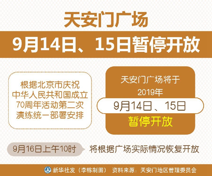 記者從天安門地區(qū)管理委員會獲悉,根據(jù)北京市慶祝中華人民共和國成立70周年活動第二次演練統(tǒng)一部署安排,天安門廣場將于2019年9月14日、15日暫停開放。9月16日上午10時,將根據(jù)廣場實際情況恢復(fù)開放。(記者魯暢)