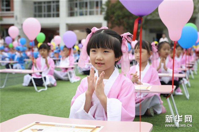 2019年9月10日,甘肅省蘭州市華僑實驗學校為一年級新生舉辦“開筆禮”儀式,讓孩子們體驗傳統(tǒng)文化,迎接新的學習生涯。