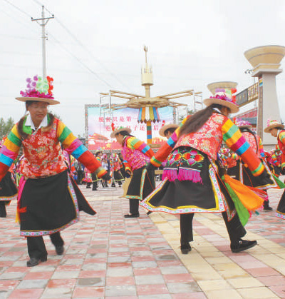 互助縣班彥新村村民在村里的文化廣場(chǎng)跳起土族傳統(tǒng)舞蹈安召舞。攝于2019年8月。新華社發(fā)