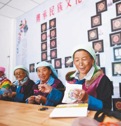 互助縣班彥新村村民在盤(pán)繡園內(nèi)制作盤(pán)繡。攝于2019年9月。新華社記者 張宏祥攝