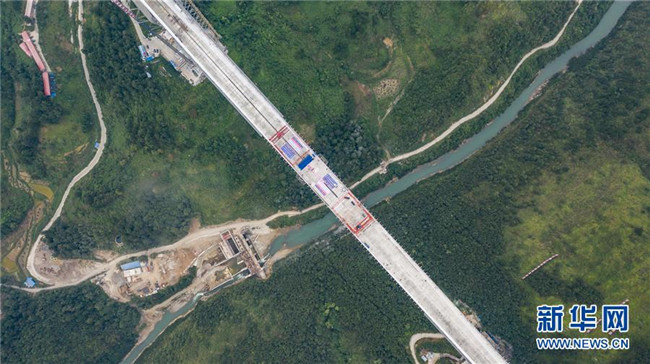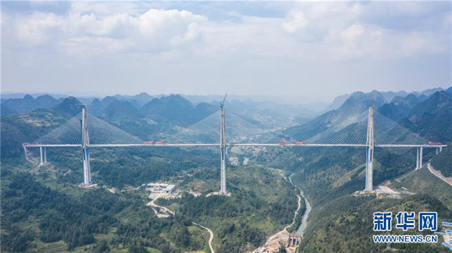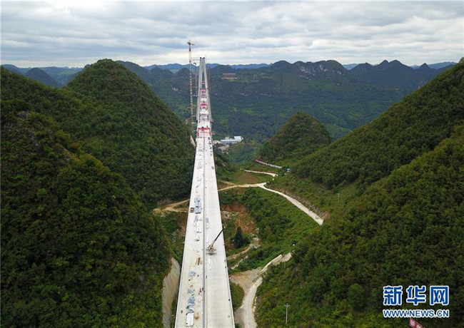 這是正在澆筑最后一方混凝土的平塘特大橋(9月26日無人機拍攝)。新華社記者陶亮攝