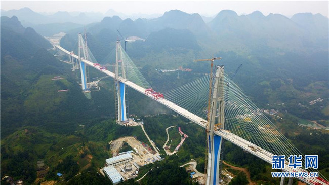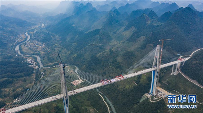 當日,332米高的全球最高混凝土橋塔——貴州平塘至羅甸高速公路控制性工程平塘特大橋成功合龍。記者從貴州省交通運輸廳了解到,平塘特大橋全長2135米,橋面寬30.2米,規(guī)劃雙向4車道,是一座三塔雙索面疊合梁斜拉橋。三座橋塔的高度分別為320米、332米和298米,相當于在峽谷之中建了三座100多層高的大樓。平塘特大橋于2016年4月開工建設,2018年11月橋塔順利封頂,計劃總工期為42個月,總投資15億元。此次合龍后,還要進行橋面施工和欄桿等工程建設,預計今年底全橋通車,屆時平塘到羅甸的通行時間將從2個半小時縮短至1小時,將成為連接貴州南部的交通要道,對助推滇黔桂石漠化片區(qū)脫貧攻堅具有重要意義。新華社記者楊文斌攝