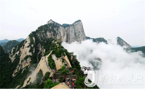 石作蓮花云作臺(tái),峰巔有巨石形似蓮花瓣,古代文人多稱其為蓮花峰,居西而得名,西北絕崖千丈,似刀削鋸截,其陡峭巍峨、陽(yáng)剛挺拔之勢(shì),為華山之最險(xiǎn)峰。