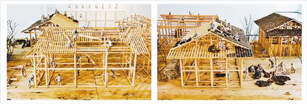 “作品分為動(dòng)工、排扇、立架、安梁、上椽、排瓦、裝修、入住8個(gè)部分,再現(xiàn)了中國(guó)民間木匠的工藝傳統(tǒng)和中國(guó)傳統(tǒng)民居營(yíng)建過(guò)程。”孫繼任介紹,為了讓作品呈現(xiàn)樸素而真實(shí)的美感,他們沒有在作品中運(yùn)用釘子或者新材料。“作品全部是純手工制作,建筑為榫卯結(jié)構(gòu),人物是手工塑造并用木柴燒制而成。”