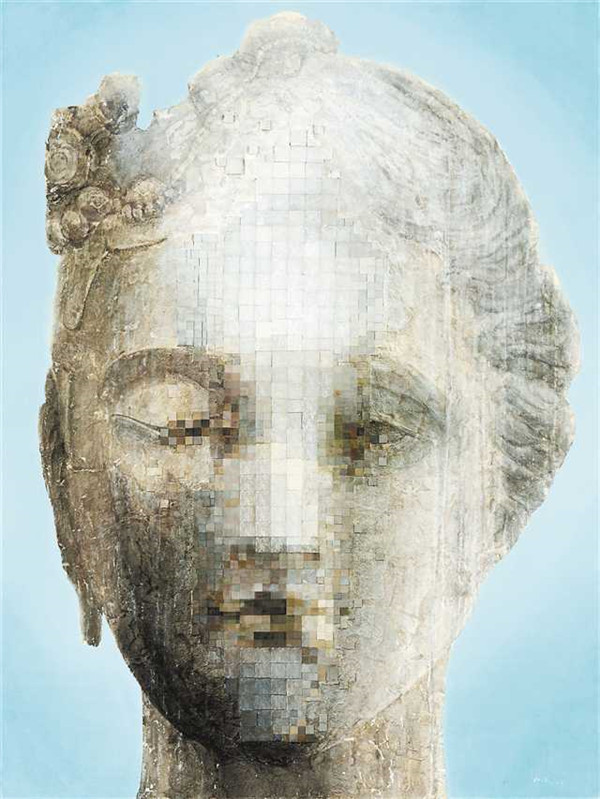 寬1.5米、高2米的油畫畫布上,被譽(yù)為“東方維納斯”的“青州龍興寺窖藏出土北齊貼金彩繪石雕菩薩像”和盧浮宮的鎮(zhèn)館之寶“斷臂維納斯”融合為一個(gè)新的形象,散發(fā)出文明交流碰撞的美感。
