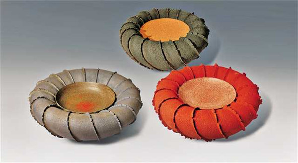 《器之欲》由3個(gè)獨(dú)立的圓形器皿構(gòu)成,器皿顏色分別為灰藍(lán)色、黑色和朱紅色,傳達(dá)出質(zhì)樸而敦厚的美感。