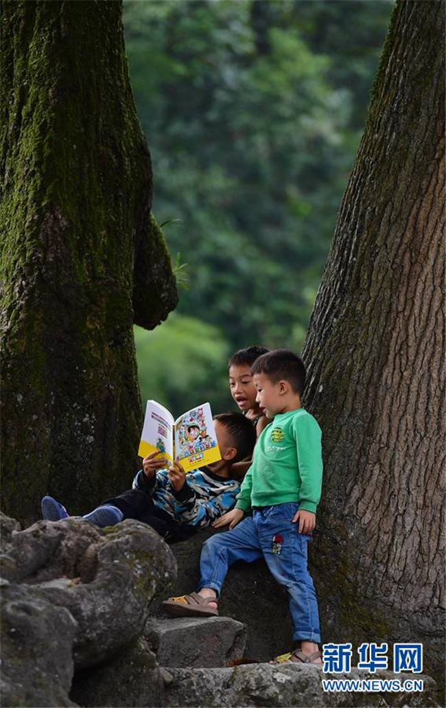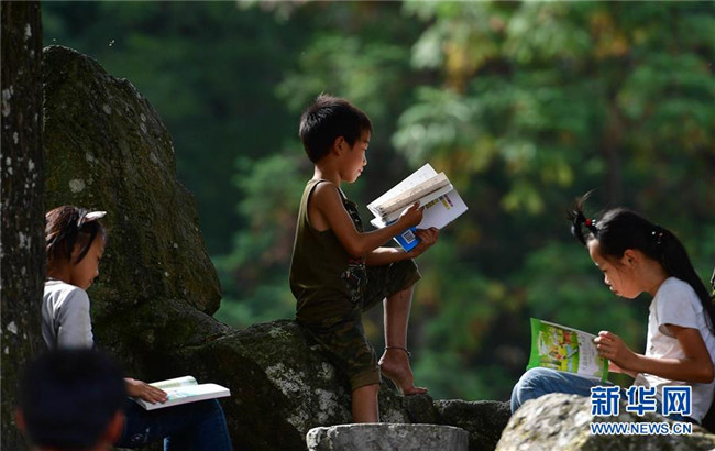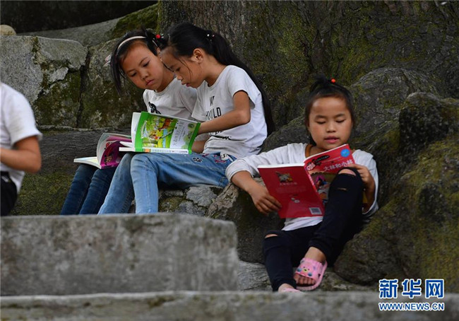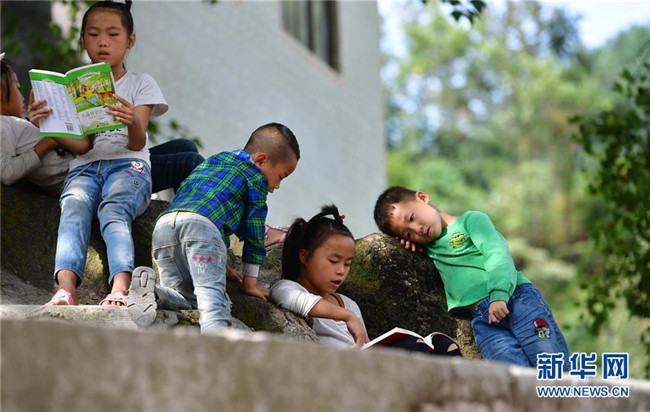 黔桂烏英苗寨的孩子們?cè)陂喿x剛剛獲贈(zèng)的圖書(shū)(10月11日攝)。新華社記者 黃孝邦 攝