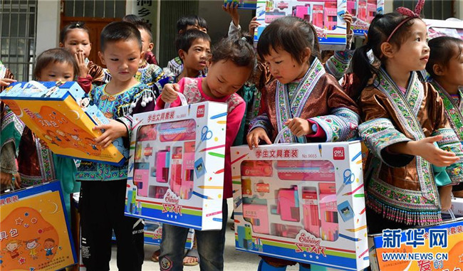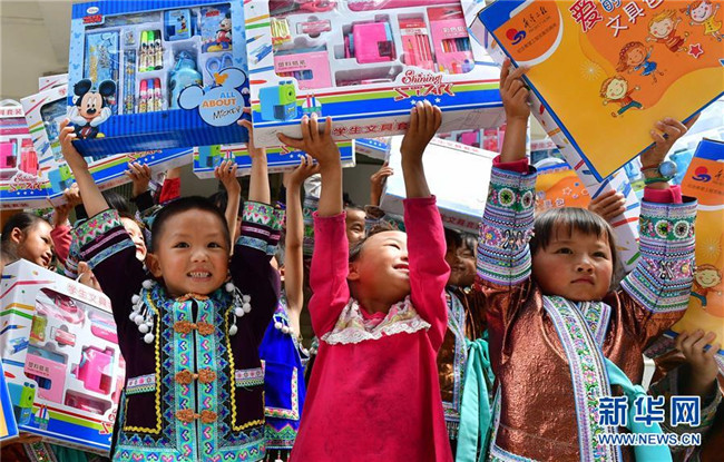 黔桂烏英苗寨的孩子們收到志愿者贈(zèng)送的文具(10月11日攝)。新華社記者 黃孝邦 攝