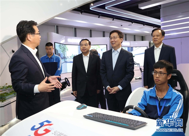 10月14日至15日,中共中央政治局常委、國務(wù)院副總理韓正在重慶市調(diào)研。這是10月15日,韓正來到禮嘉智慧公園,了解園區(qū)開發(fā)建設(shè)情況,體驗(yàn)智能機(jī)器人和5G技術(shù)在遠(yuǎn)程駕駛、教育、旅游等方面的應(yīng)用。 新華社記者 劉衛(wèi)兵 攝
