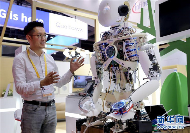 11月3日,科技生活展區(qū)的德國(guó)英飛凌公司的機(jī)器人Roboy已完成調(diào)試,它將在展會(huì)上和觀眾進(jìn)行多項(xiàng)有趣互動(dòng)。新華社記者劉穎攝