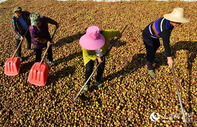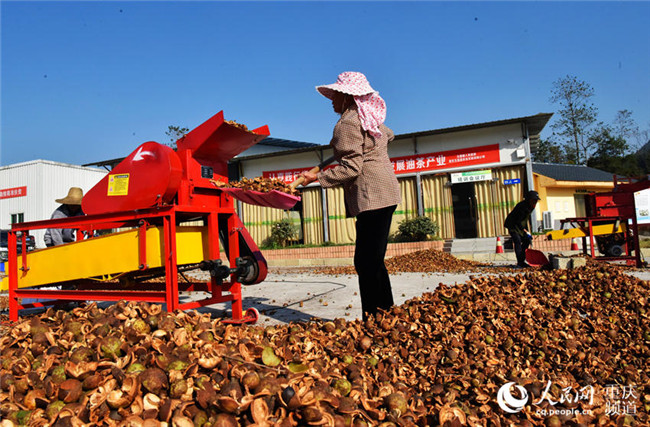 近日,重慶酉陽萬畝油茶喜獲豐收,工人們正忙著晾曬油茶籽。陳碧生攝近日,重慶酉陽萬畝油茶喜獲豐收,工人們正忙著晾曬油茶籽。陳碧生攝