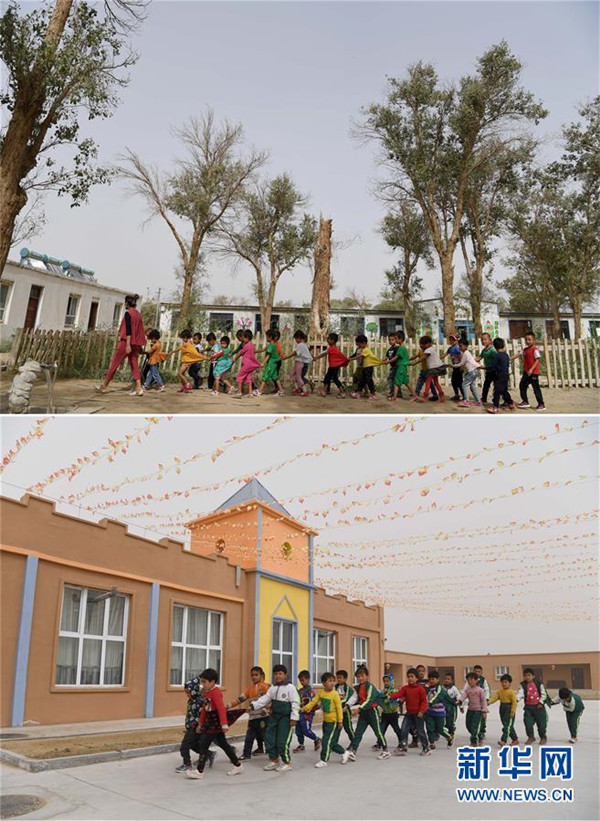 拼版照片:上圖為幼兒園學生走在易地扶貧搬遷前的于田縣達里雅布依鄉(xiāng)學校內(2018年9月5日攝);下圖為幼兒園學生走在新校園內(2019年3月20日攝)。