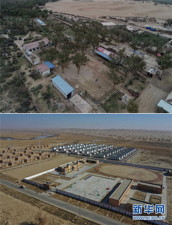 拼版照片:上圖為易地扶貧搬遷前的新疆于田縣達里雅布依鄉(xiāng)學校全景(2018年9月7日無人機拍攝);下圖為達里雅布依鄉(xiāng)易地扶貧搬遷安置點的學校新貌(2019年11月19日無人機拍攝)。新華社記者胡虎虎攝