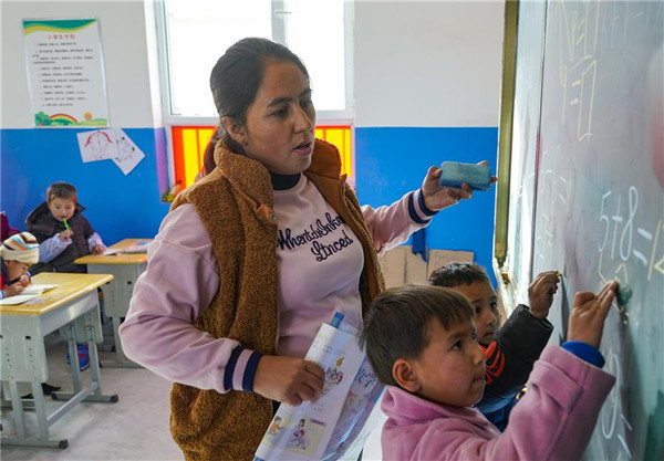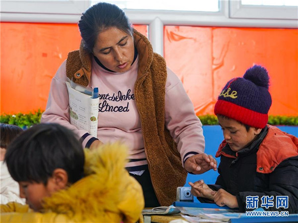 11月19日,在新疆于田縣達里雅布依鄉(xiāng)易地扶貧搬遷安置點的新學校,數學老師艾比拜木·吾布力艾山(中)在輔導一年級學生做計算題。新華社記者沈伯韓攝