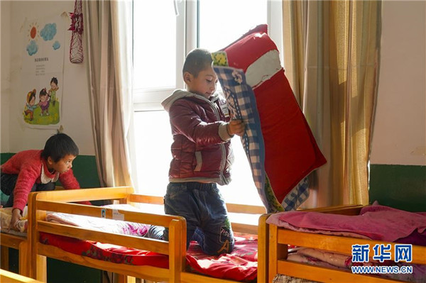 11月19日,在新疆于田縣達里雅布依鄉(xiāng)易地扶貧搬遷安置點的新幼兒園,中班孩子買買提·買和木提(右)整理枕頭被褥準備睡午覺。在該校位于塔克拉瑪干沙漠腹地的舊址,孩子們平時只能在大通鋪上休息,而在新校舍,每個孩子都有自己的木床睡。新華社記者沈伯韓攝