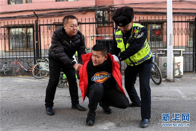 11月25日,在防暴演練現(xiàn)場(chǎng),民警和家長(zhǎng)合作制服一名“歹徒”。