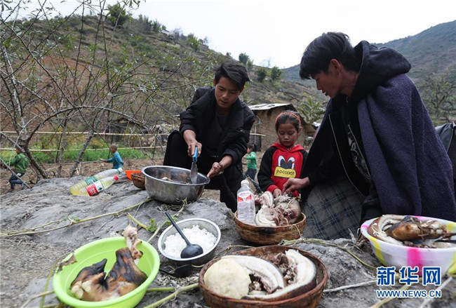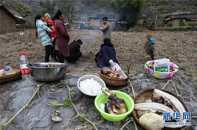11月24日,在昭覺縣支爾莫鄉(xiāng)阿土列爾村,當(dāng)?shù)鼐用駵?zhǔn)備熟食、酒等食物祭祖,并相互贈(zèng)送。