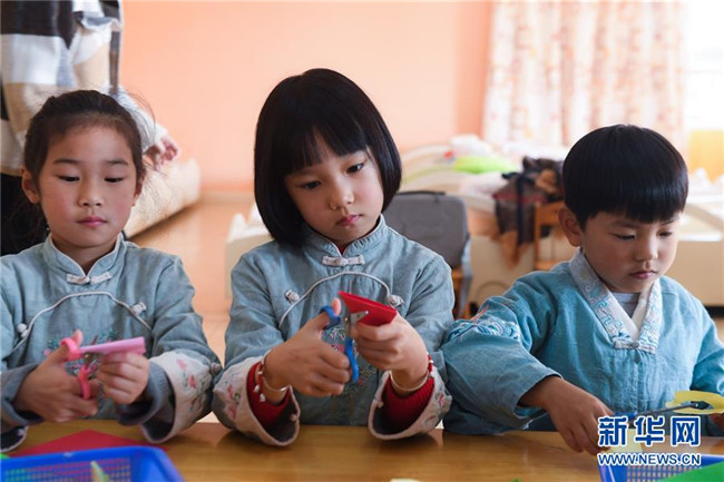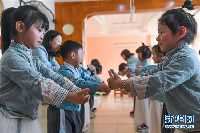 從2019年初開始,浙江省湖州市南太湖幼兒園開啟“國學(xué)課堂”,通過設(shè)立傳統(tǒng)禮儀、書法、剪紙、京劇、皮影戲等國學(xué)傳統(tǒng)文化課程,致力于將國學(xué)經(jīng)典教育滲透到幼兒日常生活學(xué)習(xí)中,培養(yǎng)幼兒的古典文化底蘊(yùn),教育幼兒從小培養(yǎng)良好的禮儀行為,讓幼兒們在傳統(tǒng)國學(xué)文化的滋養(yǎng)中成長。 新華社記者 徐昱 攝