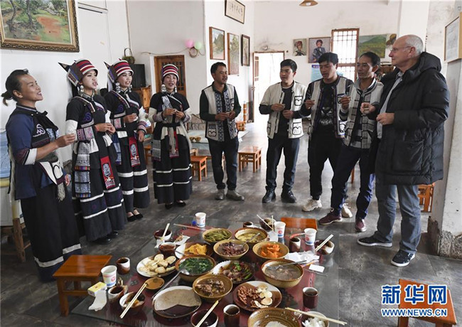 11月28日,大糯黑村村民畢興學(xué)(左五)、李學(xué)芝(左一)夫婦和工作人員們一起給外國(guó)游客(右一)祝酒。李學(xué)芝和丈夫畢興學(xué)經(jīng)營(yíng)著一家農(nóng)家樂,生意紅火。新華社記者王全超攝