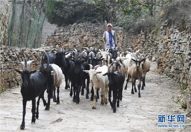 11月28日,66歲的大糯黑村村民足紹華趕著羊群前往山上放羊。新華社記者王全超攝