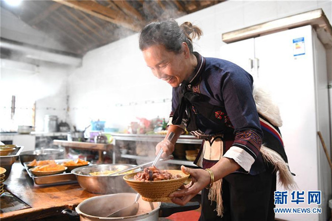 11月28日,42歲的大糯黑村村民李學(xué)芝在廚房?jī)?nèi)為游客準(zhǔn)備午餐。李學(xué)芝和丈夫畢興學(xué)經(jīng)營(yíng)著一家農(nóng)家樂,生意紅火。新華社記者周華攝