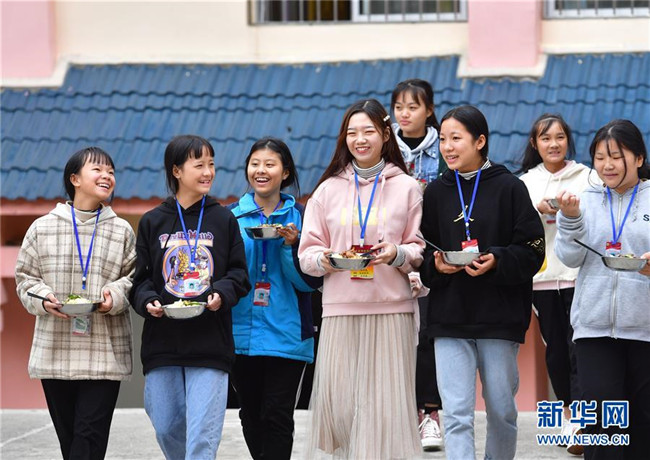 12月5日,在廣西融水苗族自治縣?;钢袑W(xué),林洋港(左四)和學(xué)生們從食堂打飯出來。林洋港是西北工業(yè)大學(xué)的在讀碩士研究生,今年9月來到融水苗族自治縣保桓中學(xué)任物理老師。新華社記者 黃孝邦 攝