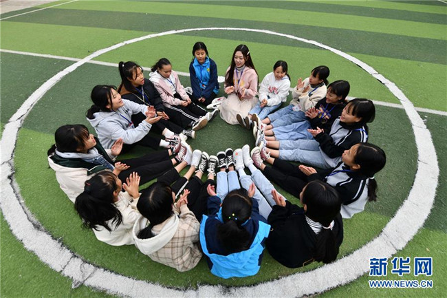 12月5日,在廣西融水苗族自治縣?;钢袑W(xué),林洋港(正面中,粉色衣服)和學(xué)生們?cè)谇驁?chǎng)上唱歌。林洋港是西北工業(yè)大學(xué)的在讀碩士研究生,今年9月來到融水苗族自治縣?;钢袑W(xué)任物理老師。 新華社記者 黃孝邦 攝