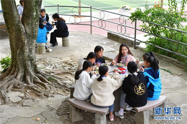 12月5日,在廣西融水苗族自治縣?;钢袑W(xué),林洋港(正面,右一)和學(xué)生們?cè)谛@里吃午飯。林洋港是西北工業(yè)大學(xué)的在讀碩士研究生,今年9月來到融水苗族自治縣?;钢袑W(xué)任物理老師。 新華社記者 黃孝邦 攝