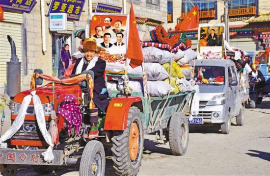 圖為打隆鎮(zhèn)邊境小康村群眾駕駛農(nóng)用車(chē)駛向幸福新家。記者 劉楓 攝