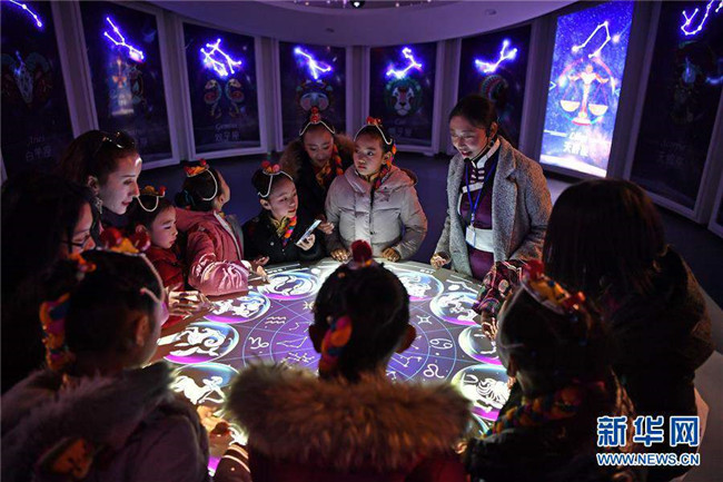 12月14日,拉薩市實驗小學學生在藏域星球天文科普體驗館學習星座知識。當日,藏域星球天文科普體驗館在西藏拉薩開館試運營,這是西藏第一家天文科普體驗館。據(jù)介紹,此館以感知宇宙、認知宇宙、探索宇宙為主題,以參觀者的第一感官體驗為設計導向,利用互動投影、懸浮投影、物體跟蹤、人體捕捉、體感互動、VR等高科技手段展示藏地的神秘,揭示宇宙的奧秘。新華社記者李鑫攝