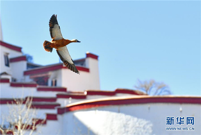 一只赤麻鴨從布達拉宮旁飛過(12月20日攝)。新華社記者 張汝鋒 攝