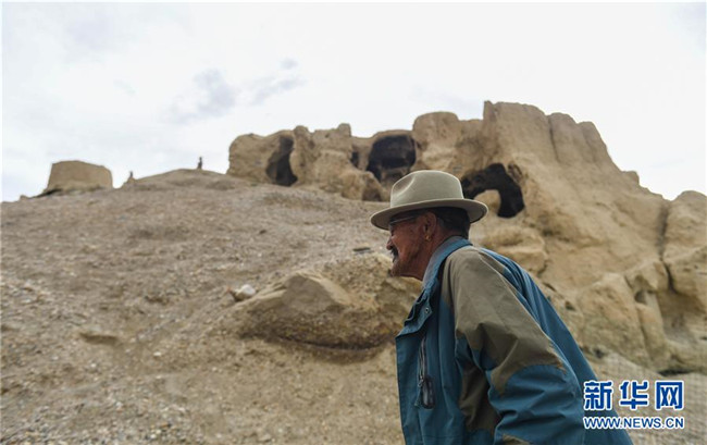 76歲的達(dá)瓦次仁走過古格遺址前的洞窟,這里曾是他的家(7月30日攝)。  新華社記者 晉美多吉 攝