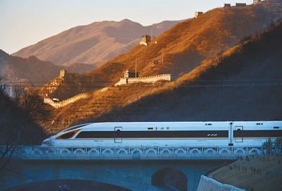 30日,京張高鐵上,一輛“復(fù)興號(hào)”動(dòng)車(chē)組駛經(jīng)北京居庸關(guān)長(zhǎng)城。本報(bào)記者 雷 聲攝