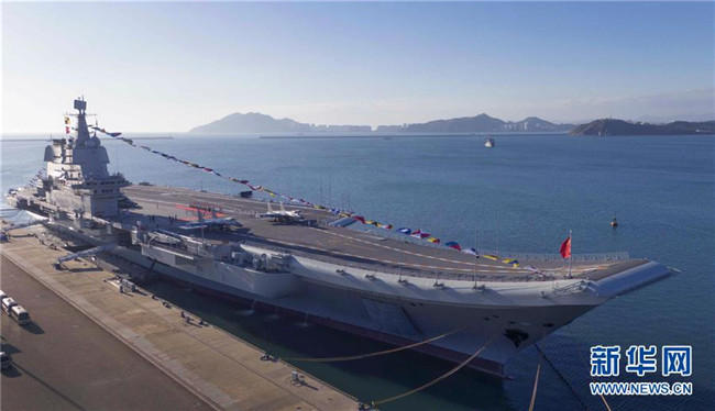 2019年12月17日,我國第一艘國產(chǎn)航空母艦山東艦在海南三亞某軍港交付海軍。經(jīng)中央軍委批準,我國第一艘國產(chǎn)航母命名為“中國人民解放軍海軍山東艦”,舷號為“17”。這是2019年12月15日拍攝的??吭诤D先齺喣耻姼鄣纳綎|艦(無人機照片)。 新華社記者 李剛 攝