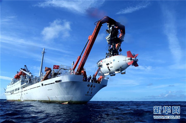 在西太平洋海域,“蛟龍”號載人潛水器離開“向陽紅09”科學(xué)考察船準備進入水中,進行中國大洋38航次最后一潛(2017年6月13日攝)。 新華社記者 劉詩平 攝