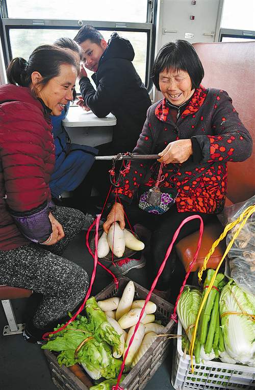 7269次列車車廂里,湖南省靖州苗族侗族自治縣太陽坪鄉(xiāng)八龍村一組的71歲苗族婦女楊炳英(右)正在為旅客稱菜。楊炳英是該村建檔立卡貧困戶,已經(jīng)乘坐“慢火車”賣菜10多年,每月能有2000多元的收入。她開心地說:“扶貧列車真好,既能掙錢,又可觀光。”