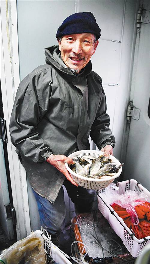 懷化至梅江的7272次列車車廂里,80歲的符長理老人帶著剛剛捕撈的魚蝦,乘車前往貴州省銅仁市菜市場銷售。