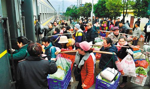 ▲停靠在湖南省麻陽郭公坪站的7272次列車,當(dāng)?shù)毓r(nóng)菜農(nóng)挑著擔(dān)子準(zhǔn)備上車。這趟“慢火車”所經(jīng)過的地區(qū)多為“老少邊窮”,經(jīng)濟(jì)欠發(fā)達(dá)。為盤活沿途百姓致富渠道,鐵路部門開“綠燈”允許乘客攜帶大量鮮活貨物乘車。