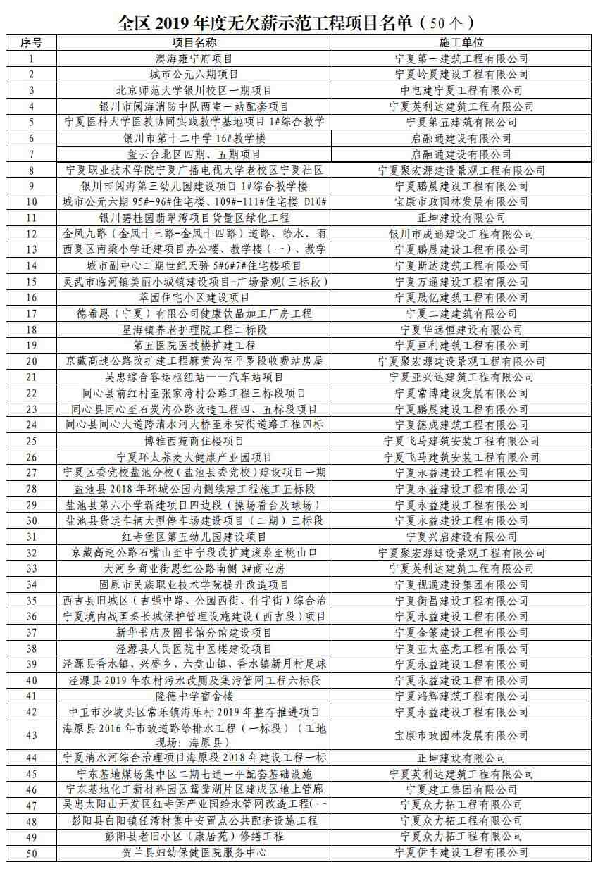 1月16日,記者從寧夏人力資源和社會(huì)保障廳獲悉,我區(qū)發(fā)布《關(guān)于2019年度全區(qū)無(wú)欠薪示范工程項(xiàng)目的通報(bào)》,對(duì)50個(gè)認(rèn)真履行農(nóng)民工工資支付各項(xiàng)政策的在建工程項(xiàng)目給予表?yè)P(yáng)及企業(yè)誠(chéng)信考核加分。