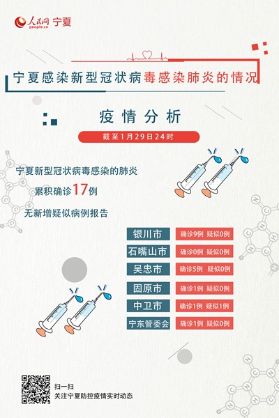 截至1月29日24時,全區(qū)累計報告新型冠狀病毒感染的肺炎確診病例17例,其中銀川市9例(興慶區(qū)3例、金鳳區(qū)2例、西夏區(qū)2例、永寧縣2例)、吳忠市5例(利通區(qū)4例、紅寺堡區(qū)1例)、固原市1例(原州區(qū))、中衛(wèi)市1例(沙坡頭區(qū))、寧東管委會1例(寧東鎮(zhèn));累計疑似病例1例(中衛(wèi)市)。