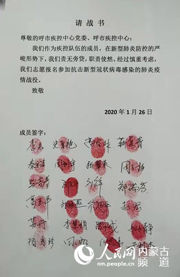 1月26日,1000封按滿紅手印的請戰(zhàn)書“刷屏”了。“在全國上下齊心協(xié)力共同抗擊新型冠狀病毒感染的肺炎疫情之際,請各位主任統(tǒng)計匯總本科室主動申請隨時去抗疫前線的醫(yī)師,并將自愿報名的名單發(fā)至本群。”呼和浩特市第一醫(yī)院普外科主任醫(yī)師烏云塔娜把“請戰(zhàn)”信息發(fā)到微信群后,手機就一直響個不停。不到一天,呼和浩特市第一醫(yī)院主動“請戰(zhàn)”的醫(yī)護人員就達到200多人。