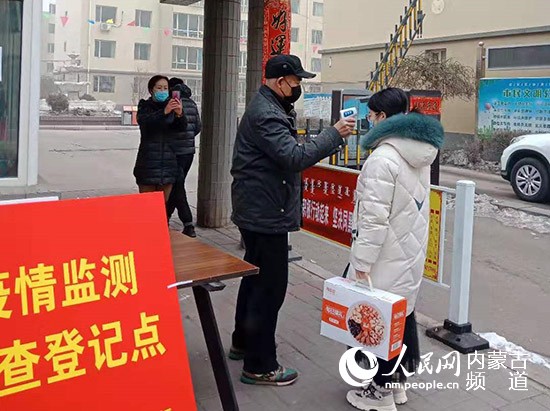 社區(qū)工作人員對出入小區(qū)的居民進行登記并測量體溫。呼和浩特市富麗社區(qū)供圖