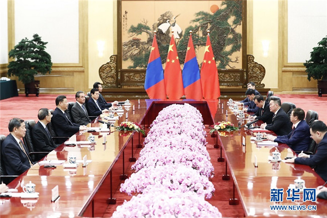 習近平指出,中蒙是山水相連的友好鄰邦。中方高度重視發(fā)展中蒙關系,始終將蒙古國作為中國周邊外交的重要方向。中方愿同蒙方一道,鞏固政治互信,加強共建“一帶一路”合作,共同推動構建命運共同體,更好造福兩國人民,為地區(qū)和平穩(wěn)定發(fā)展作出貢獻。