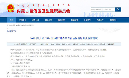 截至3月14日7時(shí),內(nèi)蒙古自治區(qū)累計(jì)報(bào)告新冠肺炎確診病例75例,現(xiàn)存確診病例3例,治愈出院71例,死亡病例1例。