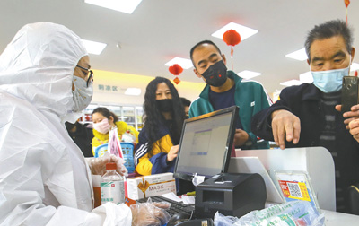 疫情期間,人們對(duì)自己的健康狀況更加關(guān)注。圖為在山東省臨沂市沂蒙路一家醫(yī)藥零售連鎖店內(nèi),消費(fèi)者正在購(gòu)買防護(hù)口罩和酒精消毒液。人民視覺(jué)