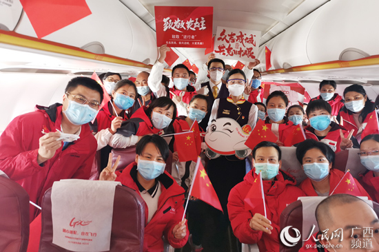 廣西援鄂醫(yī)療隊(duì)隊(duì)員在飛機(jī)上合影。韓林供圖