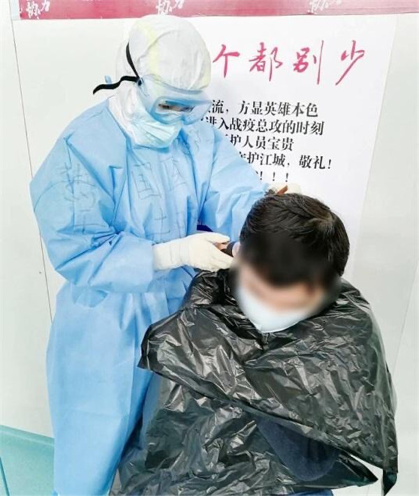 1艙有康復(fù)人員想理發(fā),手頭沒有工具,朱晴護(hù)士長得知后,聯(lián)系下個(gè)班次護(hù)士帶來推子,給大家理發(fā)。“看你動(dòng)作很嫻熟啊,以前練過的吧”,“圍觀群眾”打趣道。“現(xiàn)學(xué)現(xiàn)賣,大家要求不要太高,有壓力?。?rdquo;朱晴說。一直推到推子沒電,朱晴給6位康復(fù)人員簡單修剪了頭發(fā)。得知朱晴是西安醫(yī)療隊(duì)的護(hù)士,大家都親切的稱她“肉夾饃”!